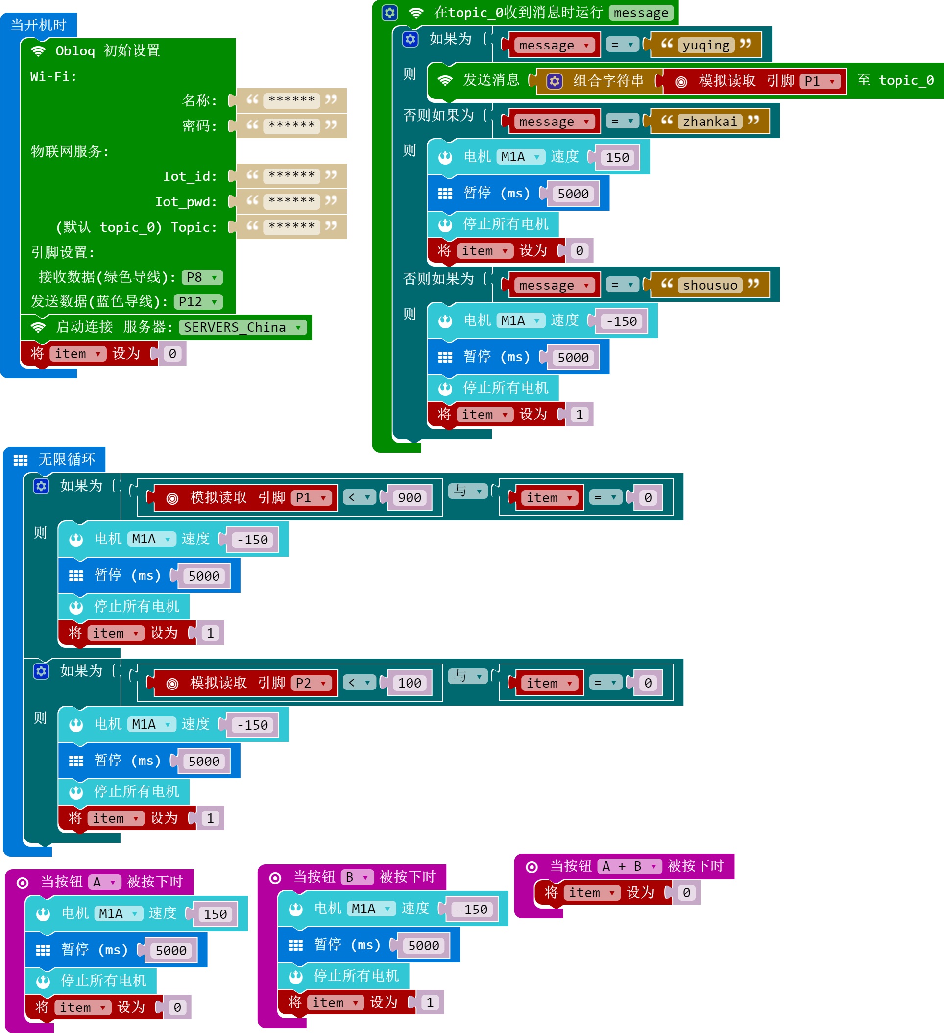 基本思路:晒衣杆的机械结构,采用类似折叠升降机的机械结构,用电机来驱动。在晒衣杆顶上安装雨滴传感器模块用于检测是否下雨,又安装光敏传感器,检测环境光。用micor:bit作为主控,用robotbit扩展板,接上雨滴模块、光敏模块和OBLOQ物联网模块,将电机接在扩展板电机输出口。这样,通过microbit程序,实现智能控制。